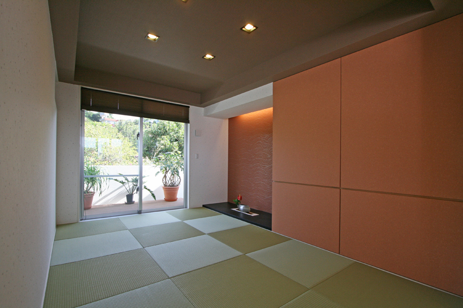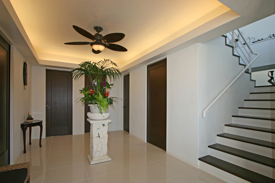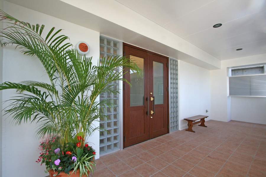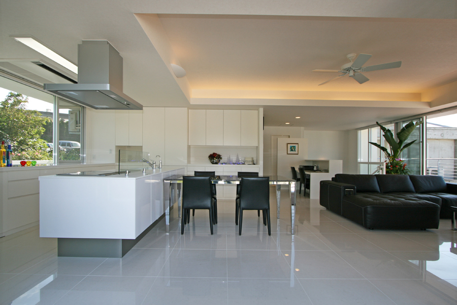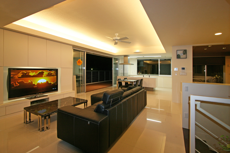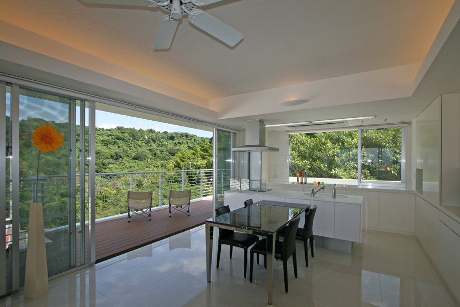 那覇市の小高い丘に建つ3階建て専用住宅。建物構造は、1F駐車場、2・3F住居です。 都心とは思えない程の大自然が目の前に広がり、日中はグリーンのパノラマを楽しみ、夜はライトアップされた街の明かりが楽しめる、二面性を持った建物です。