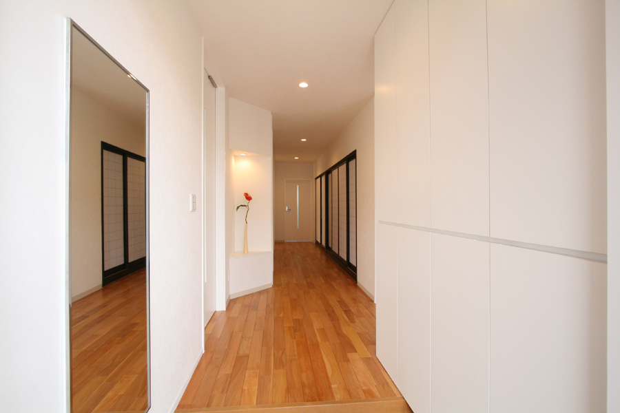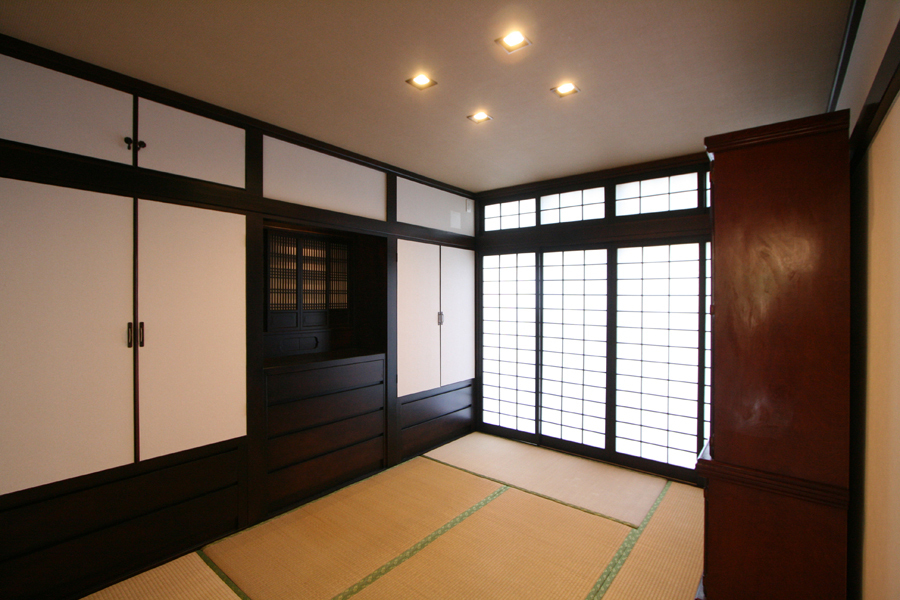 築30年の2階建て完全分離型二世帯住宅は、ご夫婦の定年を機に、住居スペースを2階部からこれまで親世帯となっていた1階部へ移り、2階部は独立していた子世帯の新たなスペースへと世代交代したお住まいです。今回は、1階部のリノベーション。これからのライフスタイルを見据えたプランとなっています。まず、日中暗かったダイニングキッチンと隣接する和室を撤去し、新たにリビングを設け、LDKが一体となった明るく広々とした空間とした。仏間と和室は、大きな変更はなくクロスの貼り替えと木部をダークブラウンへ塗装することでモダンな和室へ。夫婦の寝室はお互いの体調を気遣い別々とし、東側に位置する使用頻度の少ない応接室に奥様の寝室、南側の洋室に旦那様の寝室と、日当たりのいい場所へ配置。浴室・洗面室の水回りは、寝室からも近く生活導線も考慮した位置へ移動しています。また、リビングと寝室にはデッキテラスを新設し、趣味のガーデニングの草花に癒されながら、ゆっくりとティータイムを楽しみくつろぎのスペースへ。世代交代し新たな二世帯となったお住まいは、子供家族、お孫さんと共に過ごす賑やかな住いとなった。